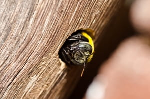 Homeowners should constantly look for small holes in wood around their home. If holes are found in the winter, bees might still be nesting inside. Call pest services professionals to properly eradicate bees from your home. Using pesticides yourself puts you and your family in danger and may not get rid of the bees entirely or cause them to return at a later point.