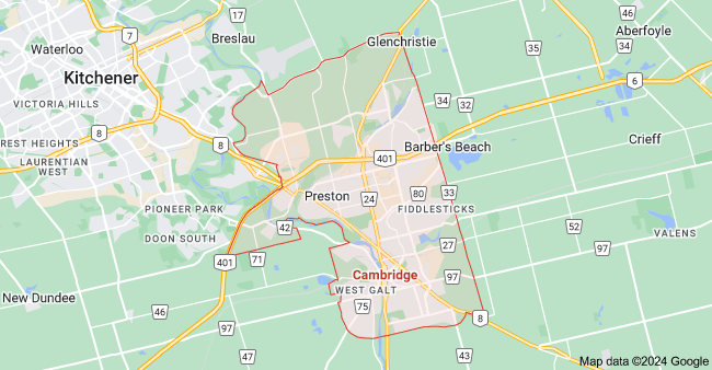 Aberfoyle, Aikensville, Barbers Beach, Cambridge, Crieff, Glen Morris, Hespeler, Paris, Preston, Preston Heights, Shep's Subdivision, Silver Heights, St. George